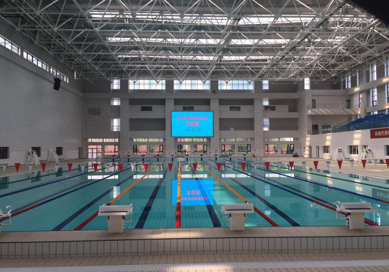 游泳館建筑面積12505平方米,場地面積4052平方米,內設兩個泳池,50米泳池標準泳道10條、25米泳池標準泳道6條,觀眾座席505個,電子顯示屏。附屬設施包括:器材室、貴賓室、更衣室、淋浴室、力量房等,并有良好的取暖、通風和先進的凈化水設備。目前主要用于教學、訓練,可承接各類游泳項目比賽及訓練。